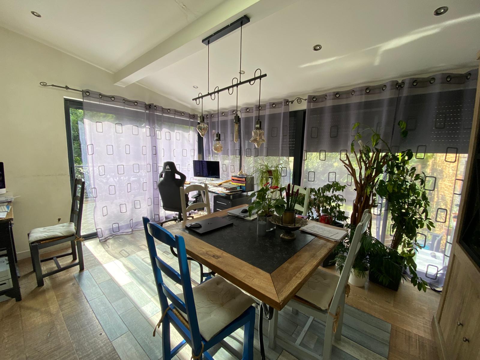 Au rez-de-chaussée : vaste séjour lumineux avec cuisine ouverte, le tout prolongé par une véranda baignée de lumière offrant une vue dégagée sur le jardin et la piscine, wc indépendant,